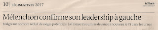 Contrastando com todas as outras notícias sobre as formações políticas, tanto a vencedora como as derrotadas, na parte de baixo da página 10, a mesma que fala de Mélenchon, aparece esta notícia praticamente necrológia a duas colunas, entalada entre anúncios legais obrigatórios e a conclusão da peça sobre a França Insubmissa: