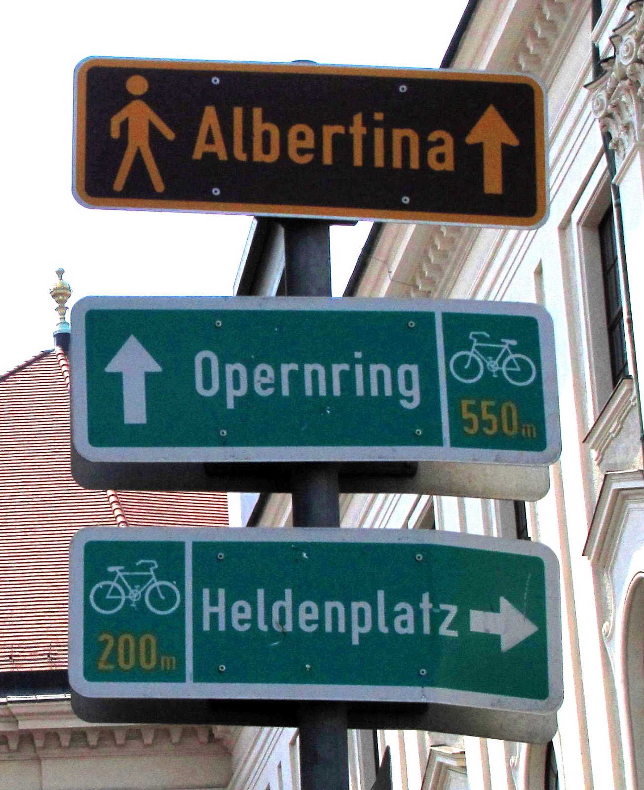 Em Viena de Áustria, por exemplo, indicando a distância em metros e o eventual transporte a usar: