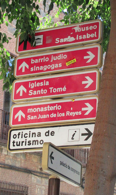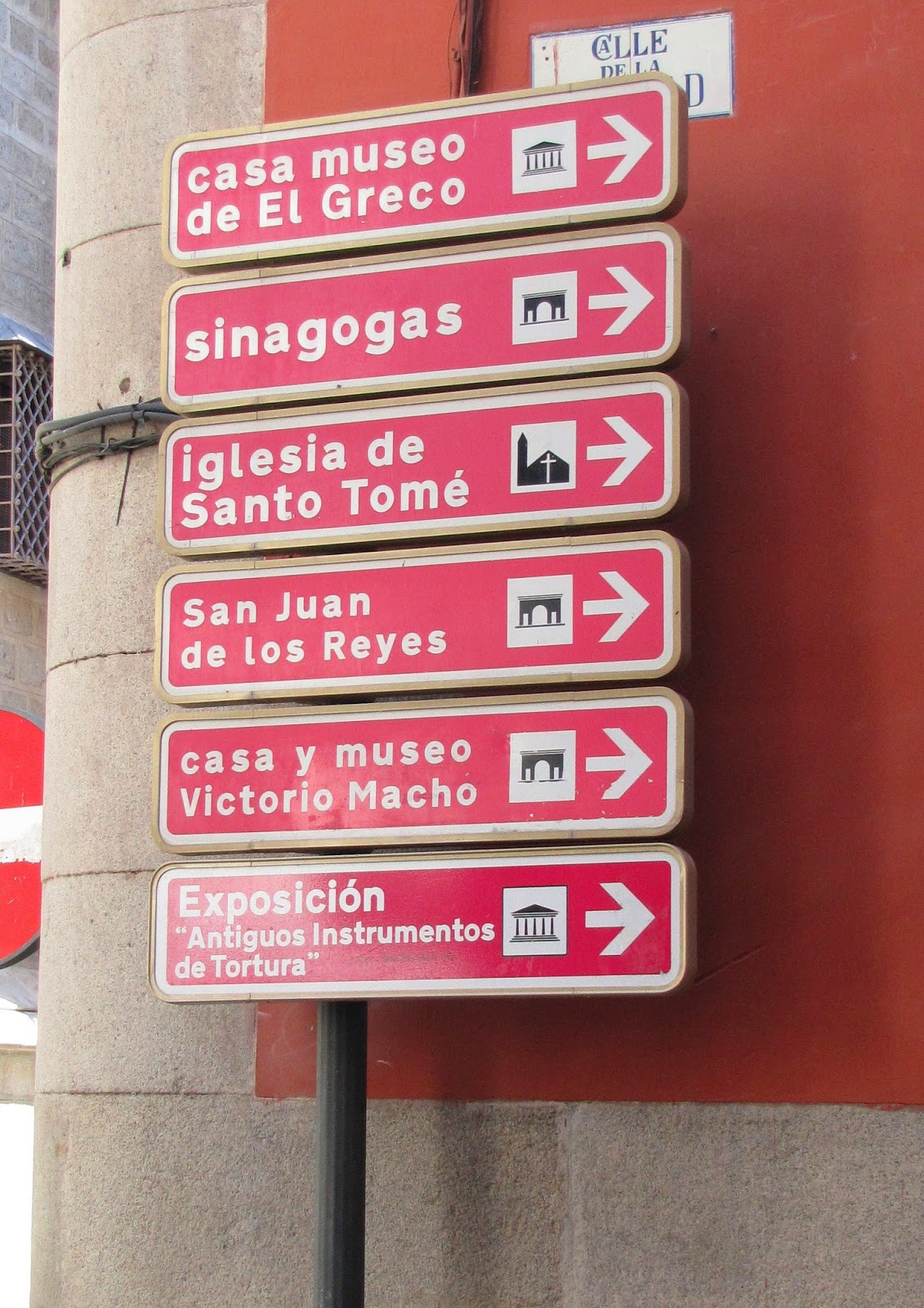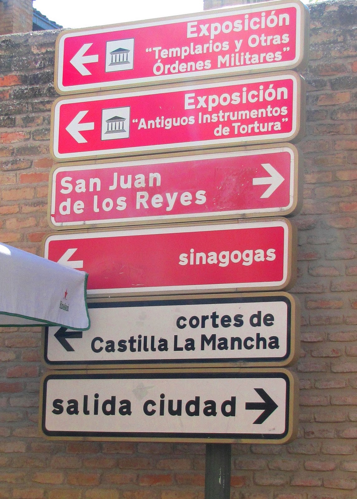 Para que se possa comparar, a seguir se publicam fotos com painéis de sinalização na cidade de Toledo. Trata-se de indicações só para pedestres, devidamente diferenciadas por cores. Fundo vermelho ou rosa para monumentos e outras curiosidades turísticas. Fundo verde para ruas e praças. Fundo branco para serviços administrativos, poder local, hotéis e saídas da cidade: