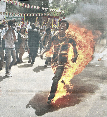 Tibetano imolando-se pelo fogo, para protestar contra a ocupação do Tibete pela China. Uma forma extremamente corajosa de contestação, de quem nunca foi eleito para isso, mas não quer renunciar ao livre exercício do seu direito e dever de cidadania. No Tibete, que fica nos Himalaias, a mais de 3 mil metros. É outra atitude, noutra altitude. E Tomar até fica numa cova...